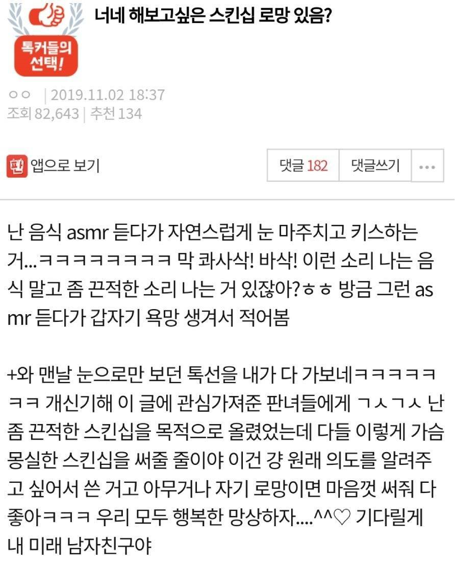 남녀의 스킨십 차이 4월 27, 2021 공유 링크 만들기 Facebook X Pinterest 이메일 기타 앱 여초 커뮤니티에 올라온 남친이 어디 만지는게 제일 싫냐는 글옆구리, 배, 목, 허벅지 등등은 못참겠다거나, 만질 수 있는 곳 말하는게 빠르다고 한다.그리고 찬반좌ㅋㅋㅋㅋㅋㅋㅋㅋ또 다른 글. 스킨십 로망을 나누는 글인데대부분 분위기를 중시하거나 가벼운 스킨십에 대한 로망그리고 찬반좌ㅋㅋㅋㅋㅋㅋㅋㅋ아마도 찬반좌들은 남자였겠지?ㅋㅋㅋㅋㅋㅋ ✕ [자동 광고 영역]스킵을 원하시면 우측 상단 X를 눌러주세요.감사합니다.